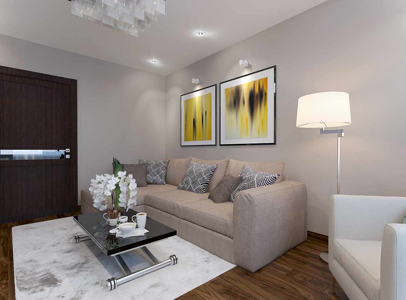 - Минимализм. Ничего лишнего, только необходимая мебель – этот стиль для малоформатных комнат наилучший. Вариантов выбора множество – японский, скандинавский, европейский (классический) минимализм. Зонируйте комнату, оформляя ее лаконичными наборами мебели. Некоторую скудность обстановки можно разбавить зеркалами, цветными яркими «пятнами» картин, панно. Следует обойтись без массивных диванов, помпезных драпировок и ковров, как на фото.