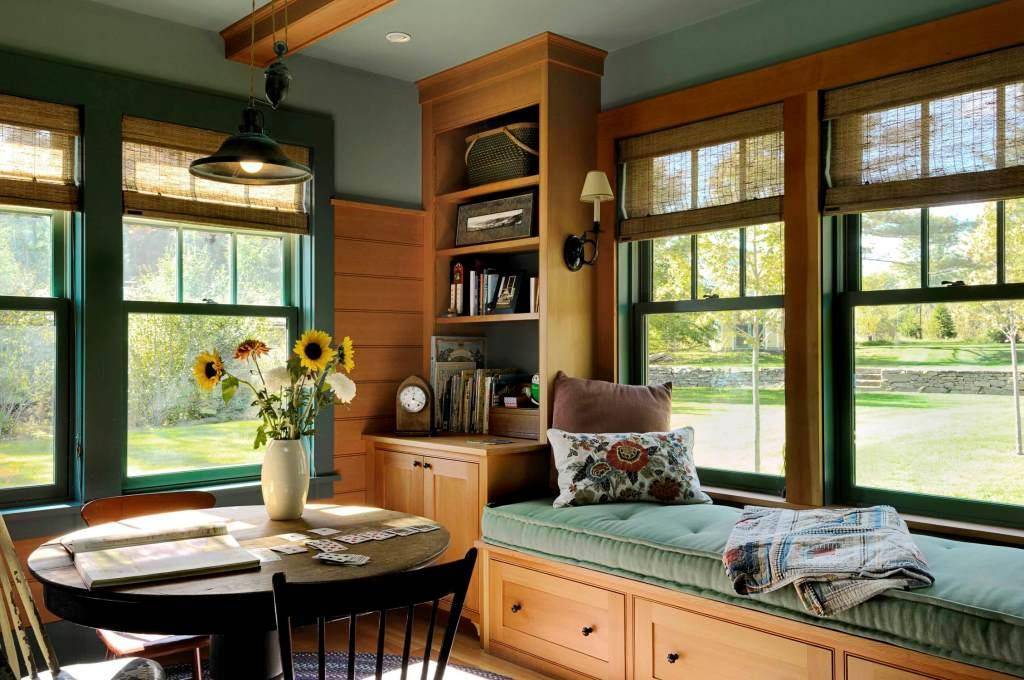 Большое пространство между оконными проемами на соседних стенах позволяет использовать его для разных целей. Обустройте в этом промежутке уголок релакса, где вы будете предаваться мечтам, читать любимые книги, заниматься рукоделием. Вам понадобится стильный торшер, удобное кресло, небольшая тумбочка для важных вещей. Еще один вариант дизайна – миниатюрный рабочий кабинет. В угол встанет письменный стол с полками, стул и компьютер; обилие дневного света будет плюсом, вид на улицу вдохновит на новые свершения, а настольная лампа разгонит вечерние тени.