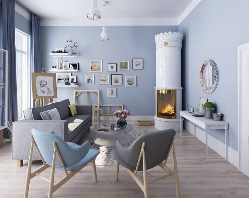 Интерьер в голубых цветах с каминомИсточник poisk-mastera.ru