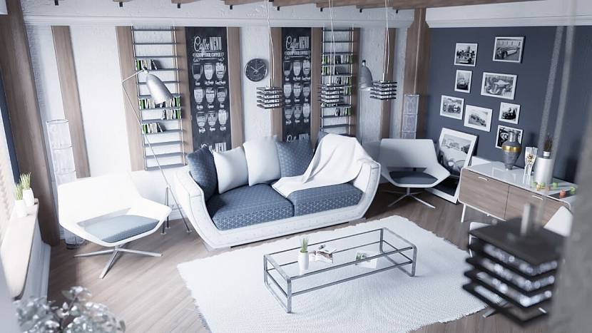 - гостиная спортивного фаната в стиле лофт или хай-тек;