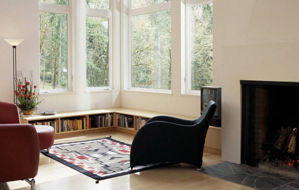 Такая планировка требует особого подхода. Дизайн зависит от величины свободного пространства в углу. Если места достаточно, туда впишется угловой диван, для маленьких пространств подойдет небольшая этажерка с книгами, высокий комод, узкий стеллаж, мягкое кресло. Здесь же установите телевизор. Если окна располагаются впритык под углом, а гостиная невелика, используйте пространство под подоконниками. Там поместятся невысокие, вместительные шкафы, комоды, полки для книг, закрытые системы хранения.
