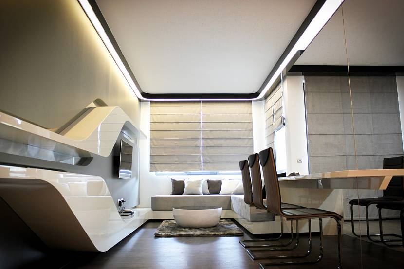 Меблировка гостиной небольшой гостиницы в футуристическом стилеИсточник design-t.ru