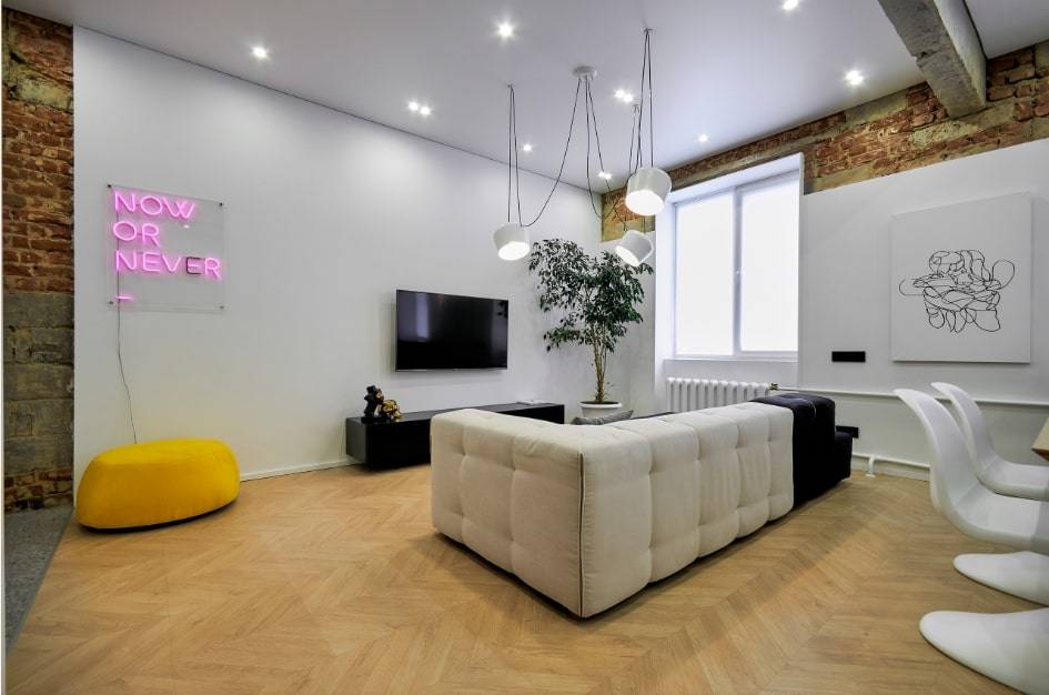 Конечно же, в классическом виде лофт в гостиной решится сделать далеко не каждый. Дизайнеры умело адаптировали его и предлагают делать только одну акцентную стену из кирпича. Она может быть строительной или же сделанной из специального материала. При желании можно использовать и другие элементы, такие как бетонная стена или потолок с заметным перекрытием. Но чаще всего в оформлении гостиной ограничиваются одной кирпичной стеной. Ну и конечно же, такими деталями, как люстра необычной формы, батареи черного цвета и т.д. Интересно, что именно для стиля лофт характерны различные журнальные столики. Они могут быть выполнены из строительных поддонов. Кстати при желании их можно сделать своими руками.