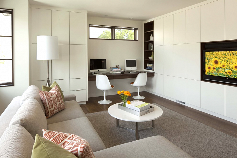 Гостиная с рабочим местом выглядит привлекательно, когда все правильно организовано. Если площадь гостевой комнаты позволяет, то всегда можно выделить зону для занятий и отделить ее от остальной территории, где домашние предаются отдыху.
