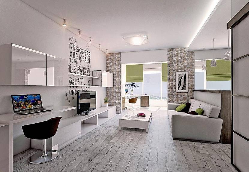 - Комната с лоджией. Для малогабаритной студии лоджия – находка, позволяющая увеличить полезную площадь. Её утепляют, а затем оформляют в едином стиле с остальным пространством. В лоджии организовывают спальное место, уголок отдыха или рабочий кабинет. Стену с внутренним окном иногда демонтируют полностью, иногда частично оставляют, чтобы получить оригинальную деталь интерьера.