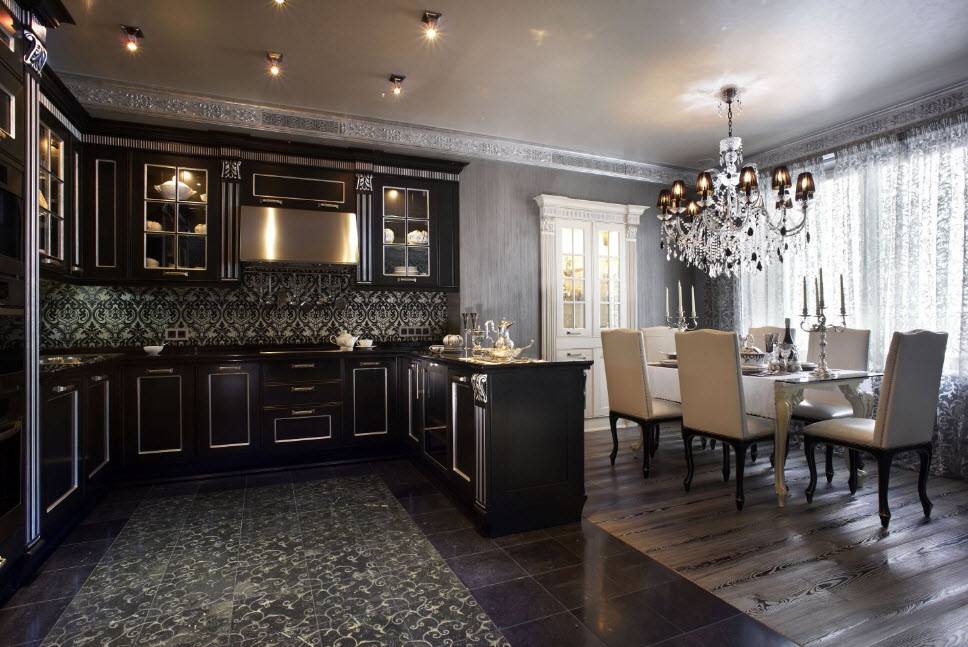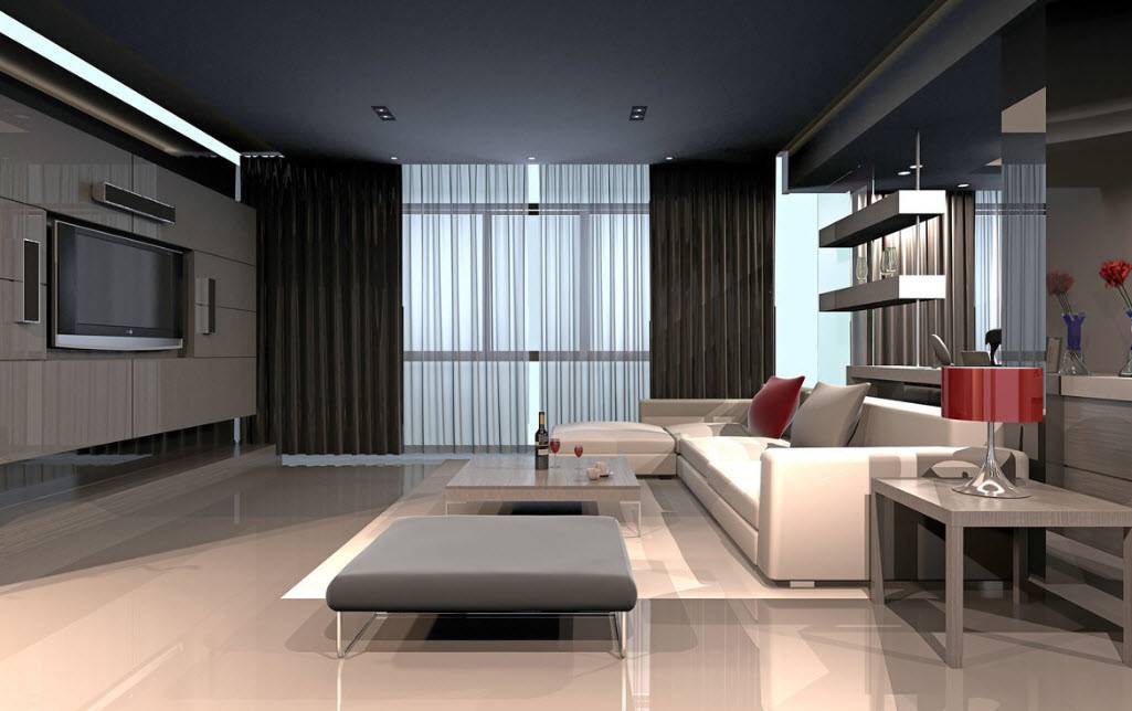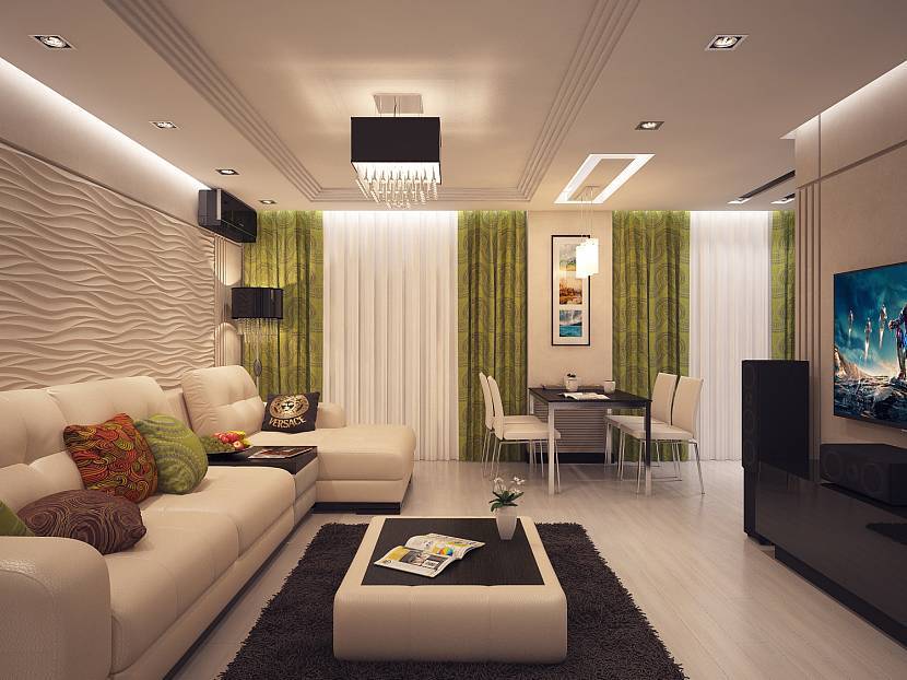 Оформление комнаты темными цветами также возможно. Но тогда необходимо устанавливать большие, просторные окна, которые занимают собой полностью всю стену. Плотный поток солнечного света разбавит черные тона элементов внутреннего убранства зала. Яркие акценты уместны. Подбирается насыщенный цвет. Ярко-зеленый и другие будут хорошей идеей, воплощающей к жизни ваши мечты.