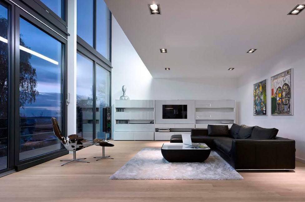 Освещение гостевой комнаты оказывает определяющее действие на дизайн гостиной в частном доме. Если естественного света достаточно, элементы интерьера отделываются темными тонами. К примеру, напольное покрытие укладывается из фактурного черного ламината.