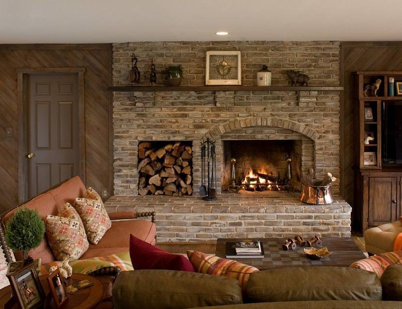 - Камин как главный элемент. Все внутреннее обустройство обыгрывается вокруг камина, рядом с которым гармонично уложены аккуратные поленья.