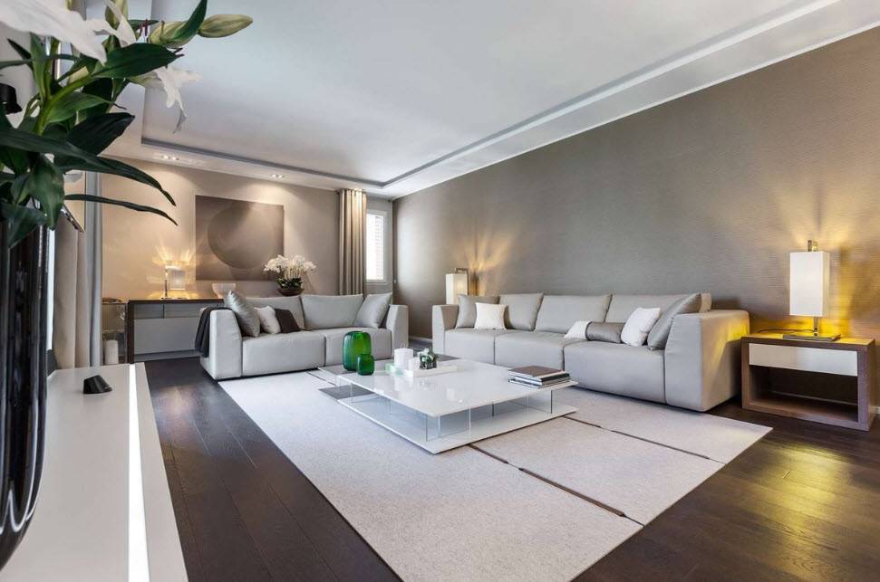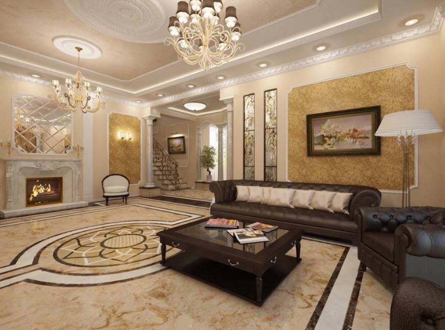 Классическими покрытиями для пола гостиной являются плитка, паркет и ламинат.