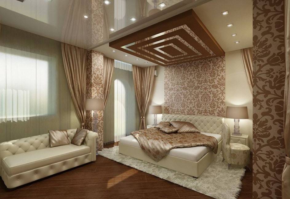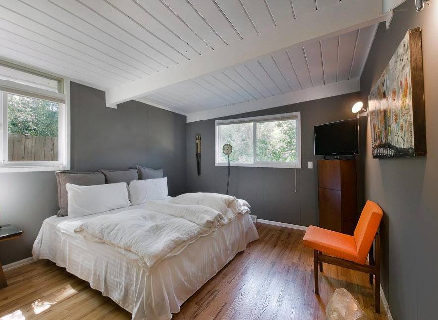 - Если вы не можете сделать натяжной потолок, покрасьте его глянцевой светлой краской. А также более дешевой альтернативной, чем подвесная конструкция, станет гипсокартонный вариант.