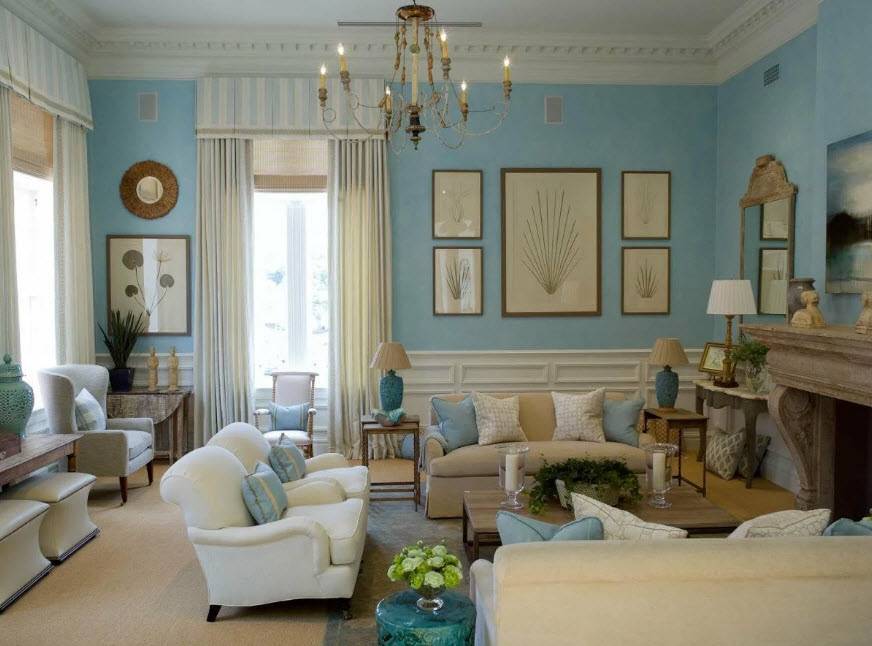 Холодные цвета используют для небольших гостиных, так как они визуально расширяют пространство. Синий, голубой, серебристый придают комнате шик, делают изысканным любой интерьер.