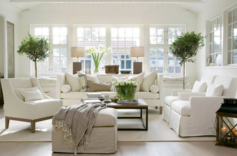 Для скандинавского стиля характерна белоснежная отделка стен и потолков, а также использование деревянного настила или паркетной доски для напольного покрытия. Кроме того, скандинавский стиль подразумевает наличие больших светлых окон без штор, поэтому естественный свет буквально заполняет всю комнату. Чтобы оформить гостиную в стиле кантри, нужно использовать природные материалы, в частности древесины, которая идет для отделки стен и потолка. Это поможет сблизиться с природой, особенно если использовать нейтральные оттенки для отделки стен и мебели, чтобы они не отвлекали от красоты пространства.