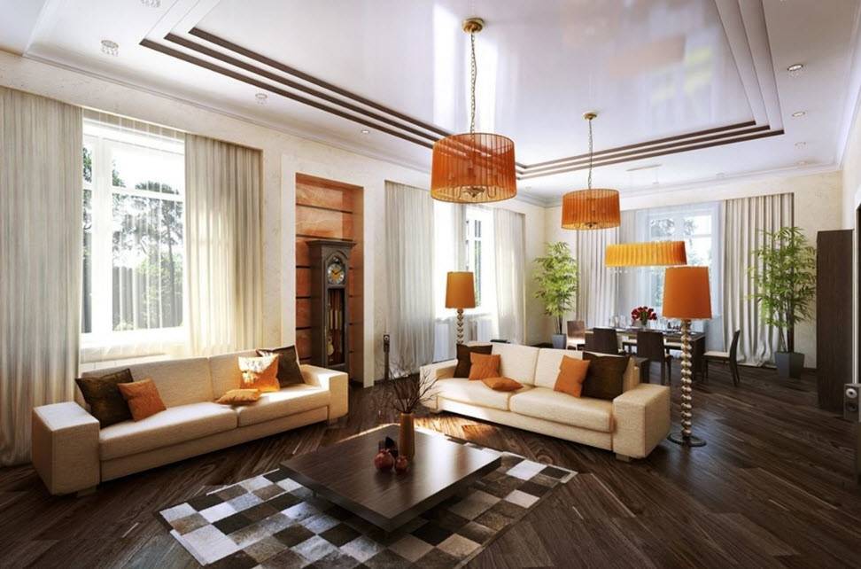 Для оформления потолка гостиной используют все современные варианты отделки: