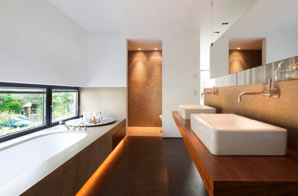 Модерн не нуждается в постоянном использовании контрастной гаммы, ярких цветов. Стильного решения можно добиться с помощью монохромного или постельного сочетания. Важный акцент в отделке ванной делается именно на стены и пол, ведь именно они представляют собой фон для сантехники.
