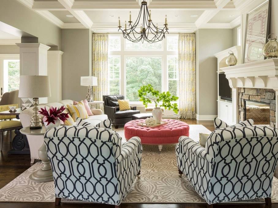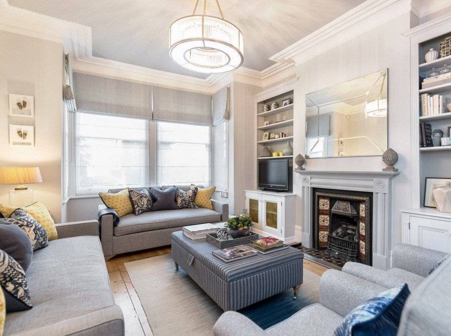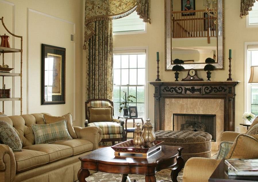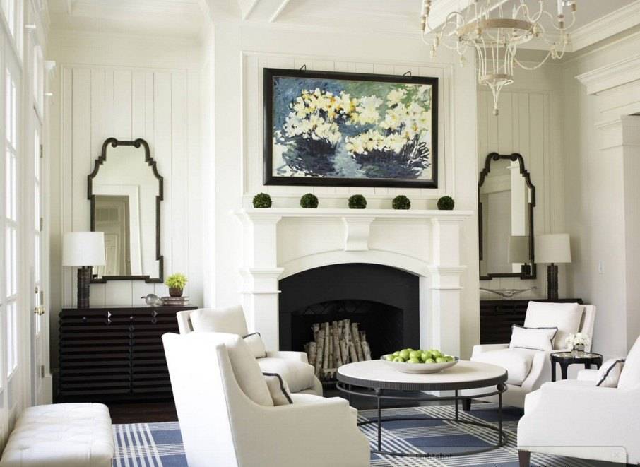 В расположении мебели в гостиной важно соблюдать классическую симметрию. Поэтому в таких пространствах часто используются парные предметы, располагающиеся друг против друга. В комнате с камином диван и кресла обычно располагают рядом с ним, чтобы было удобно наблюдать за очагом и отдыхать под треск горящих поленьев