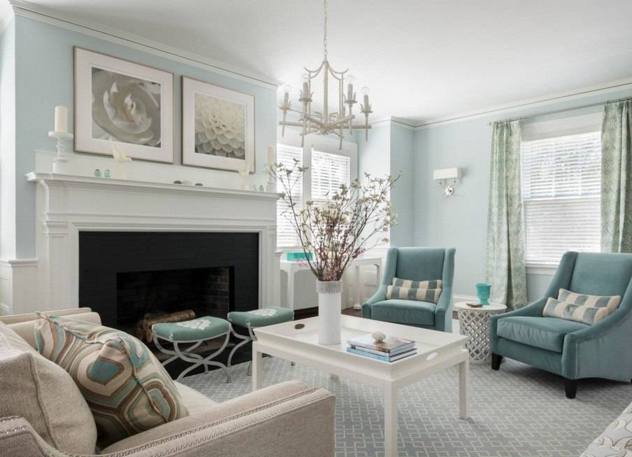 На фото бирюзово-белая гостиная в морском стиле.