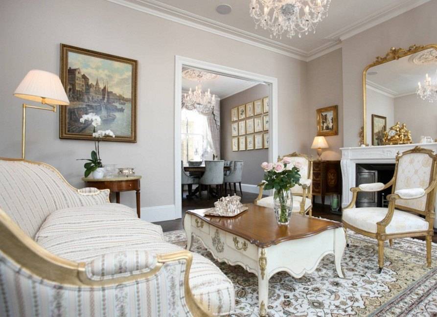 Стены украшают картинами в красивых позолоченных рамах с изображением классических сюжетов картин известных художников. Здесь же располагают портреты обитателей дома и их родственников, но только живописные. Разные фотопринты и постеры в классическом интерьере неуместны. Традиционным предметом гостиной является большое зеркало, обрамлённое изысканной резной рамой.