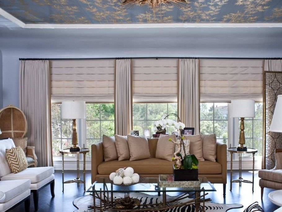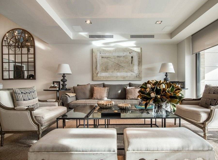 Потолок в таком интерьере делается светлым. Это может быть навесная конструкция, состоящая из нескольких слоев и декорированная точечным освещением. Что касается мебели, то в гостиной размещается диван (это может быть современная модель, выдержанная в минималистском стиле) буфет и комод. Если размеры гостиной позволяют, здесь можно расставить мебельные предметы по парам. Так как симметричная расстановка является основой пространственной композиции. В качестве основного центра в таком интерьере выступает камин (традиционный или электрический).