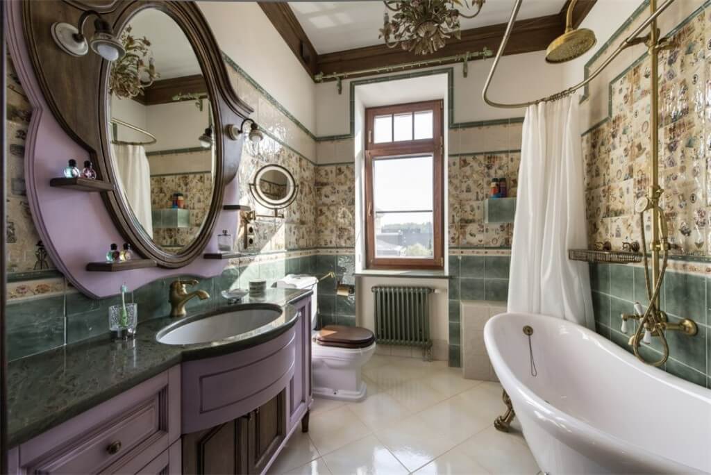 На фоне стен с плиточным покрытием красиво смотрится ванна с изогнутыми ножками, которая может выступать в виде композиционного центра. Если есть желание вписать в ванную душевую кабину, то следует выделить для нее место в углу, обустроив всей необходимой сантехникой. Современные модели кабин будут неуместны.