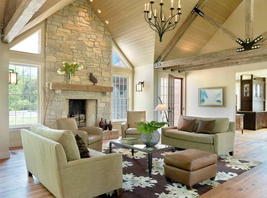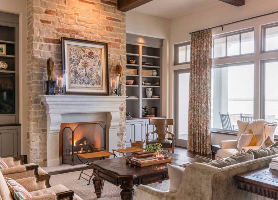 В комнате с камином диван и кресла обычно располагают рядом с ним, чтобы было удобно наблюдать за очагом и отдыхать под треск горящих поленьев.