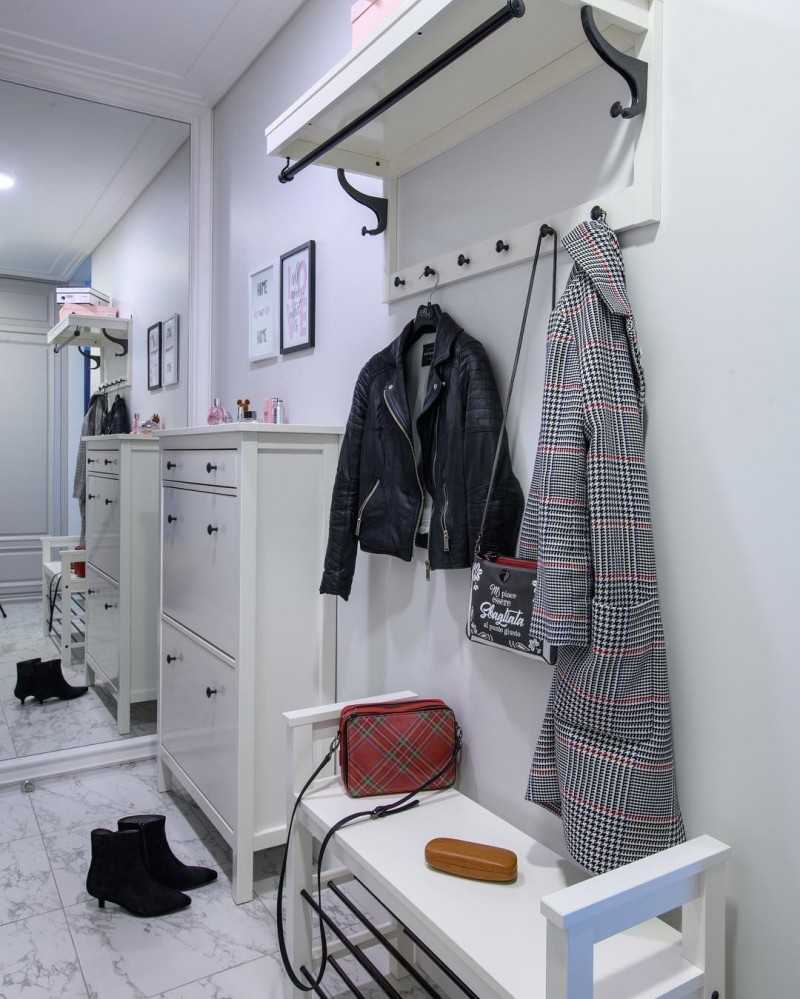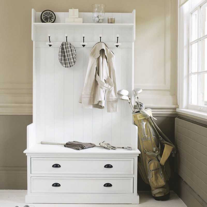 Скамейка или банкетка, на которую можно присесть, чтобы завязать шнурки, или поставить сумку; зеркало; дополнительные органайзеры для хранения перчаток, зонтов и других мелочей – вещи очень полезные, но поместятся не в каждом случае в силу ее размеров помещения.