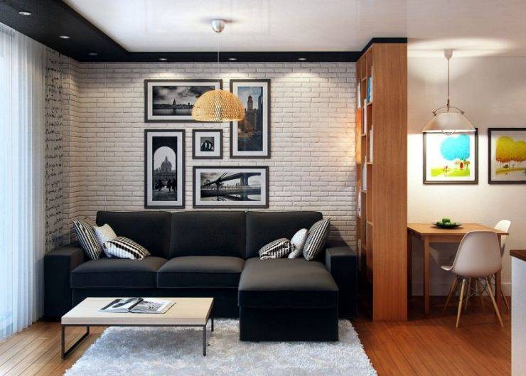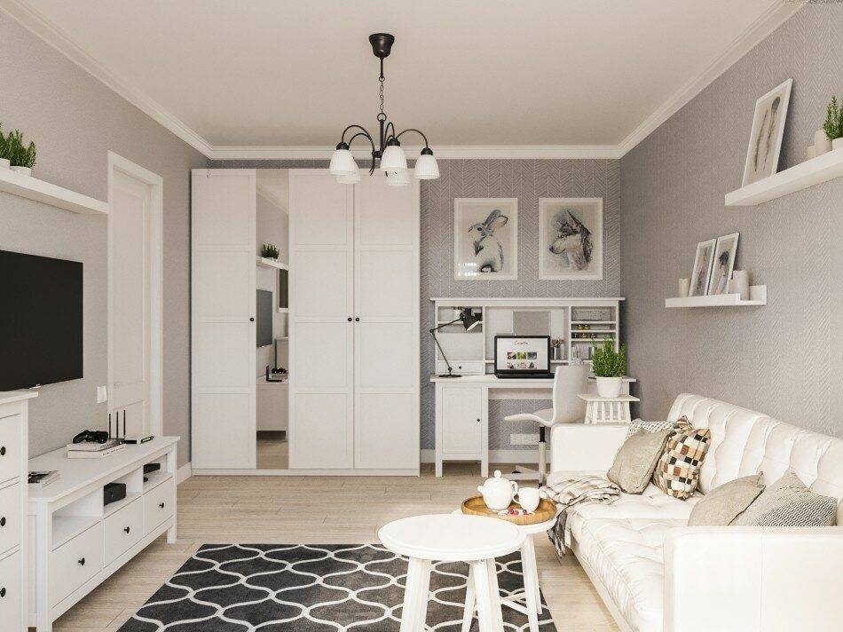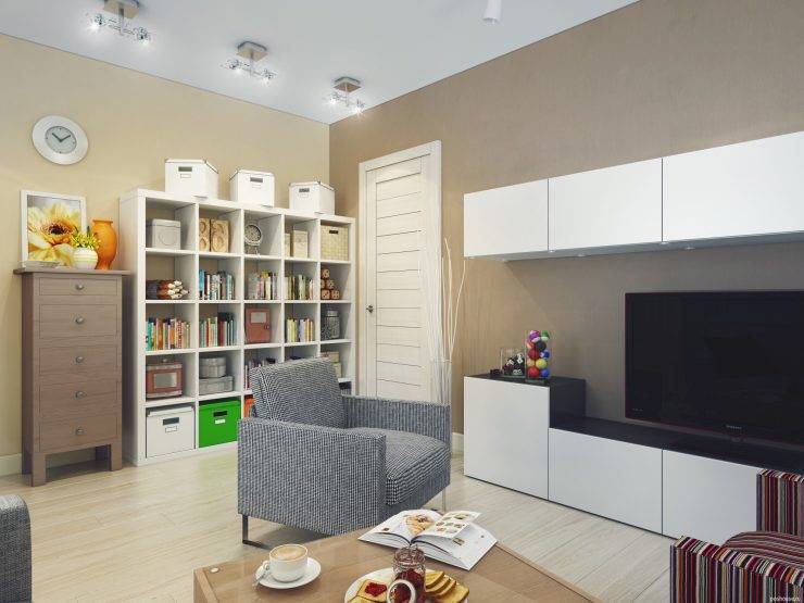 Маленькая площадь остро ставит вопрос грамотной организации хранения. Оптимальным решением здесь будет функциональная кровать с подъемным механизмом. Шкафы лучше выбирать с раздвижными, а не распашными дверями.