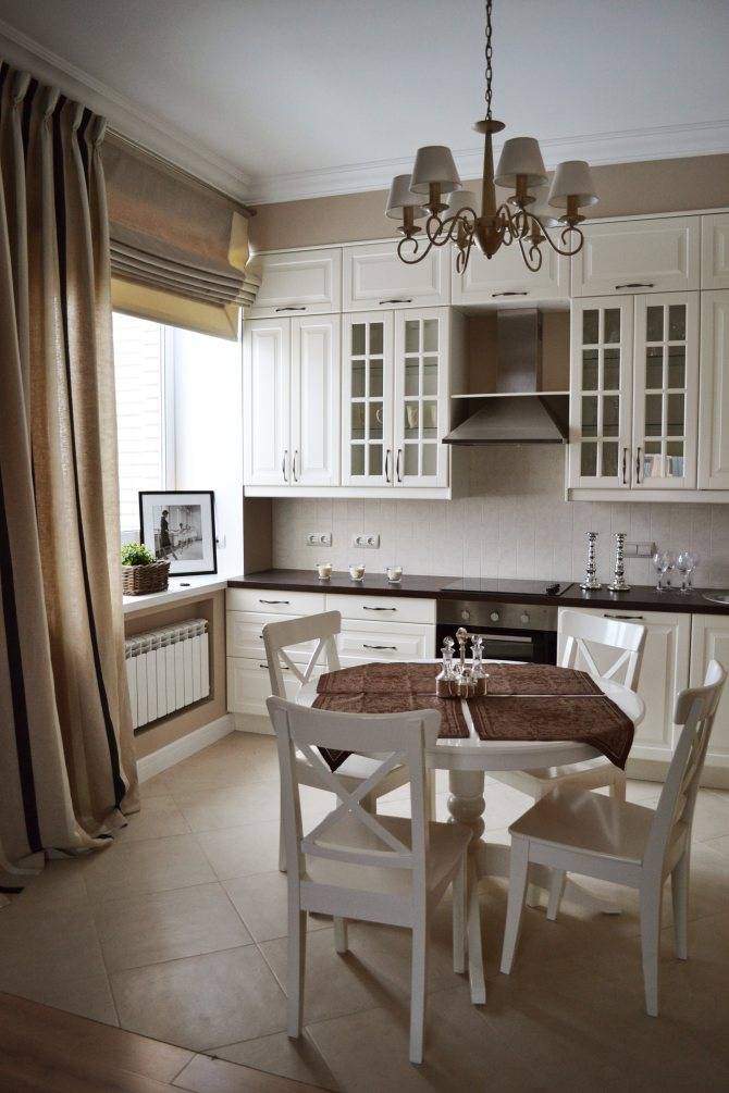 Помимо удобства перемещения между двумя, расположенными перпендикулярно, рабочими зонами, вы получаете возможность установки в центре комнаты обеденной группы. Подобная расстановка является наиболее традиционной для кухонных помещений, которые совмещают и функции столовой.