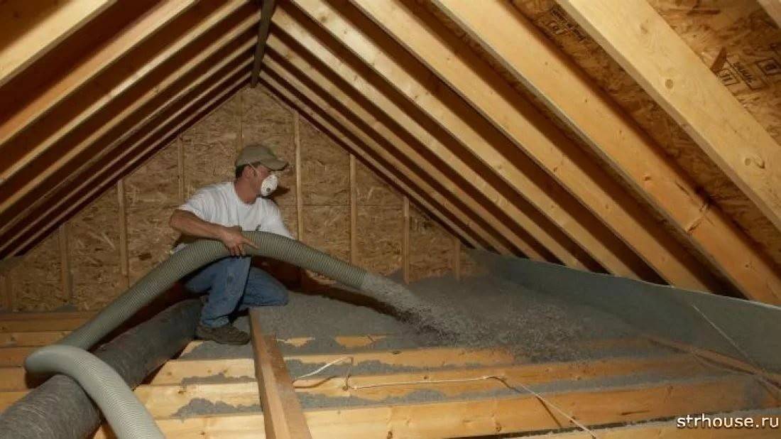 Для утепления чердака и пола должен использоваться засыпной материал: опилки или керамзит. В чердачном помещении также можно использовать сухие морские водоросли и солому. Утеплить пол можно минеральной ватой рулонного типа, положив ее под половое покрытие.