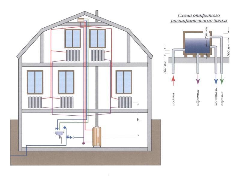 Система отопления открытого типа отличается от предыдущего типа только конструкцией расширительного бака. Данная схема чаще всего использовалась в старых зданиях. Преимуществами открытой системы является возможность самостоятельного изготовления емкости из подручных материалов. Бачок, обычно имеет скромные габариты и устанавливается на кровле или под потолком жилой комнаты.