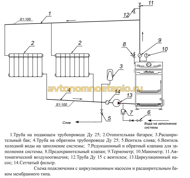 - В случае с принудительной системой отопления монтируется циркуляционный насос. Специалисты, рекомендует сделать обводной участок трубопровода, который в случае поломки насоса возьмёт нагрузку на себя.