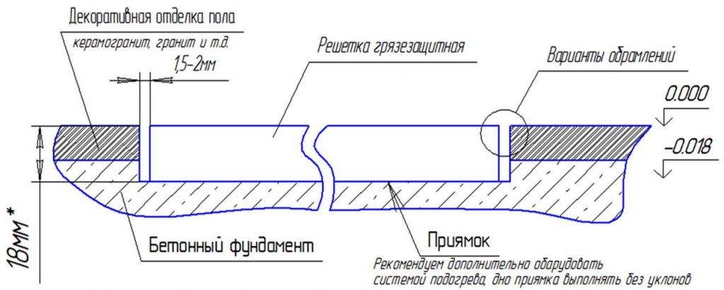 При небольшом количестве прохожих – подойдет вариант углубления соизмеримого с высотой профиля решетки. Дно приямка должно быть выполнено без уклонов во избежание деформирования или смятия очистного покрытия в процессе эксплуатации.