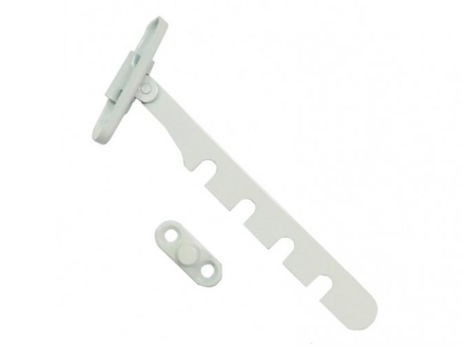 Количество прорезей у каждого вида разное. Может быть от 4 до 10, что позволяет больше или меньше открывать створки и фиксировать его в таком положении. Чаще всего в магазинах встречаются четырехпозиционные модели. Штифт, к которому крепится сама пластиковая гребенка, располагается по-разному – под ручкой или на торце рамы. С другой стороны расположено крепление, на которое надевается гребенка своими прорезями.