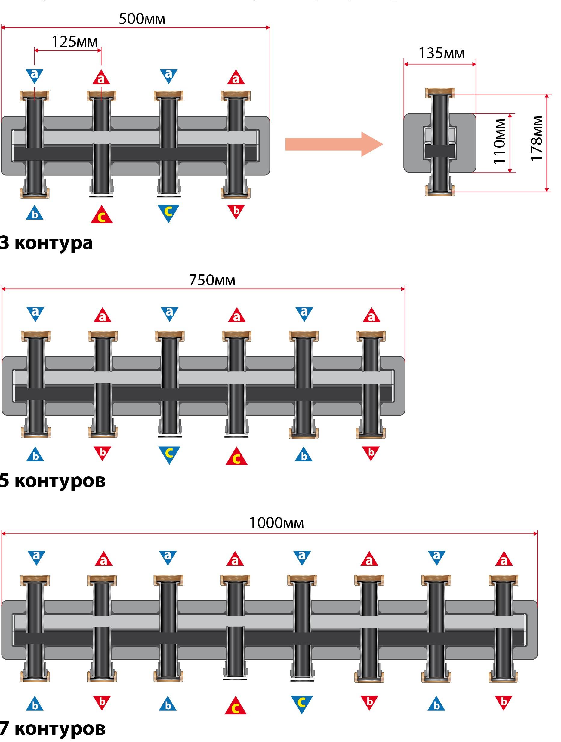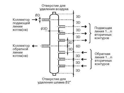 Сечение коллекторной трубы равняется 3-м диаметрам подключаемых патрубков, расстояние между подающей и обратной гребенками — 6 диаметрам, удаленность патрубков друг от друга составляет 3-и диаметра