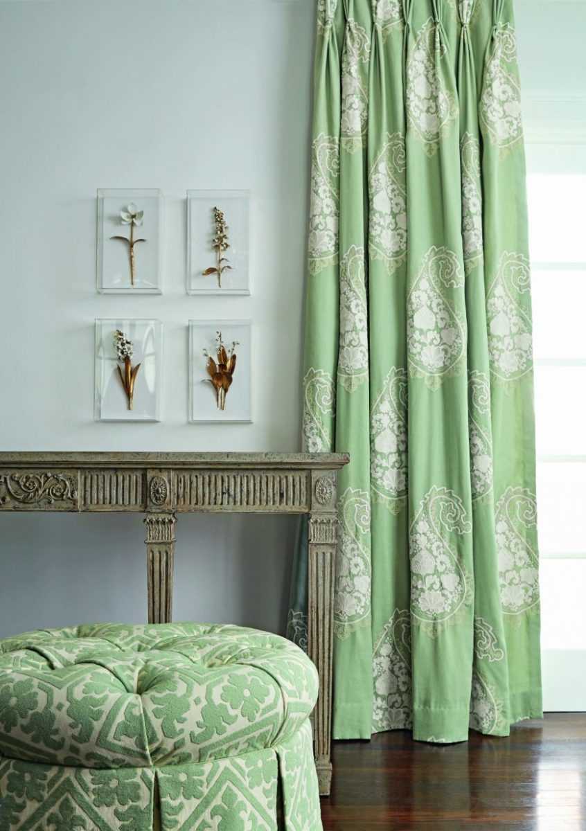 Тона оливковых занавесей отличает богатство палитры. Благодаря атмосфере свежести и умиротворения, текстиль такого оттенка часто используют для подчёркивания традиционности обстановки. Применяют его и при обустройстве студий.