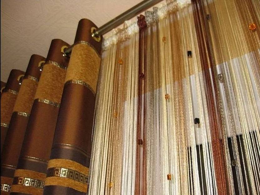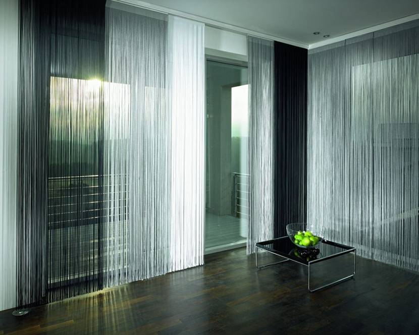 - Полупрозрачные нити. Отлично смотрятся на панорамных окнах. Их невесомый вид делает помещение просторным и светлым.