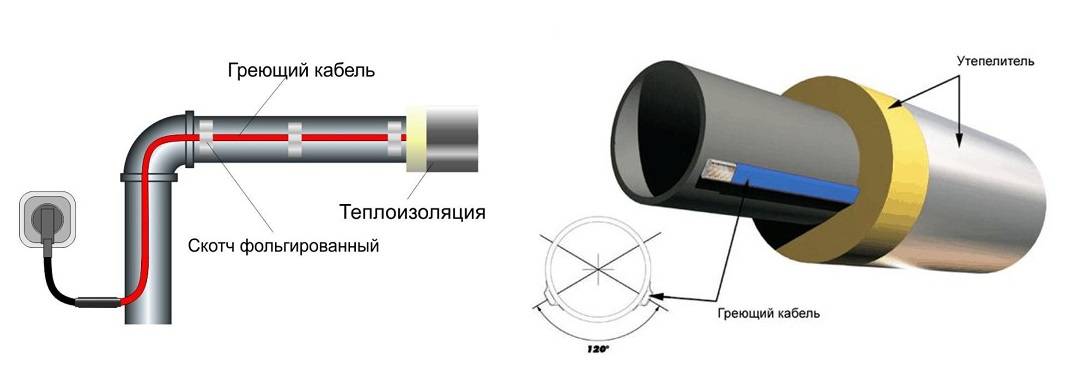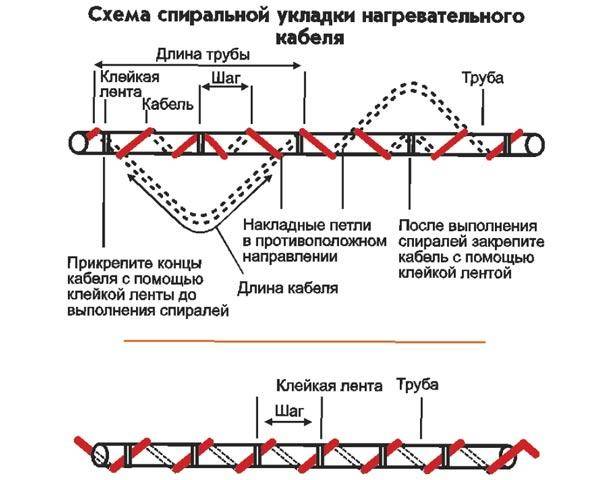 Снаружи все проще — нужно всего лишь обмотать трубу. Есть два основных способа — линейный и круговой. Линейный способ предполагает прокладку провода параллельно трубе и максимально плотно к ней. Круговой метод крепления подразумевает обмотку равномерными витками с определенным шагом (5-6 см). Иногда обмотку производят спиральным способом (например, на крыше).