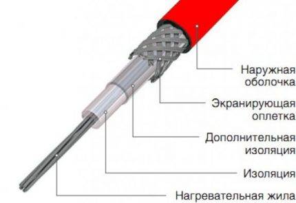 Схема резистивного одножильного кабеля содержит четыре основных элемента: медную жилу, которая сочетает функции нагревания и передачи тепла, внутреннюю и внешнюю защиту, армирующую оплетку