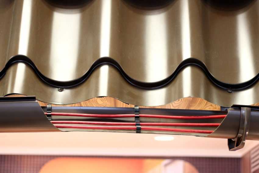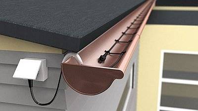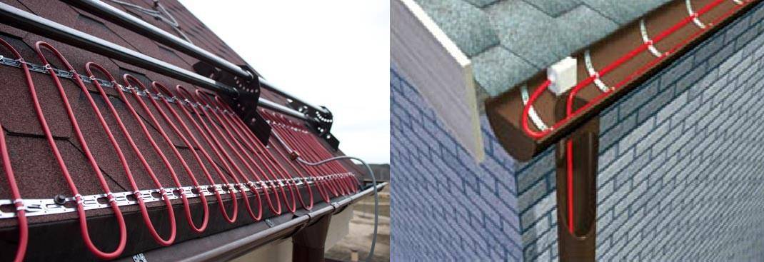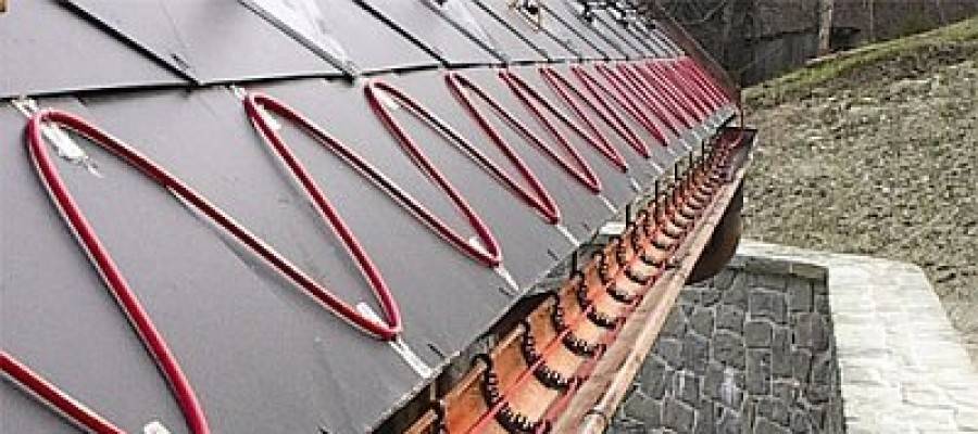 Для водостоков и крыш устройство нагревательной системы монтируют вдоль периметра кровли, в желобах и трубах водостока, закрепляют с помощью зажимов, подвешивают на тросы. Если крыша имеет сложное устройство с большим количеством желобов, выбирается древовидная схема прокладки. Разветвленные отрезки могут соединяться в 3-4 узла.