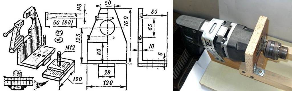 Чертежи держателя дрели для использования ее как привода домашнего металлорежущего станка даны слева на рис.: