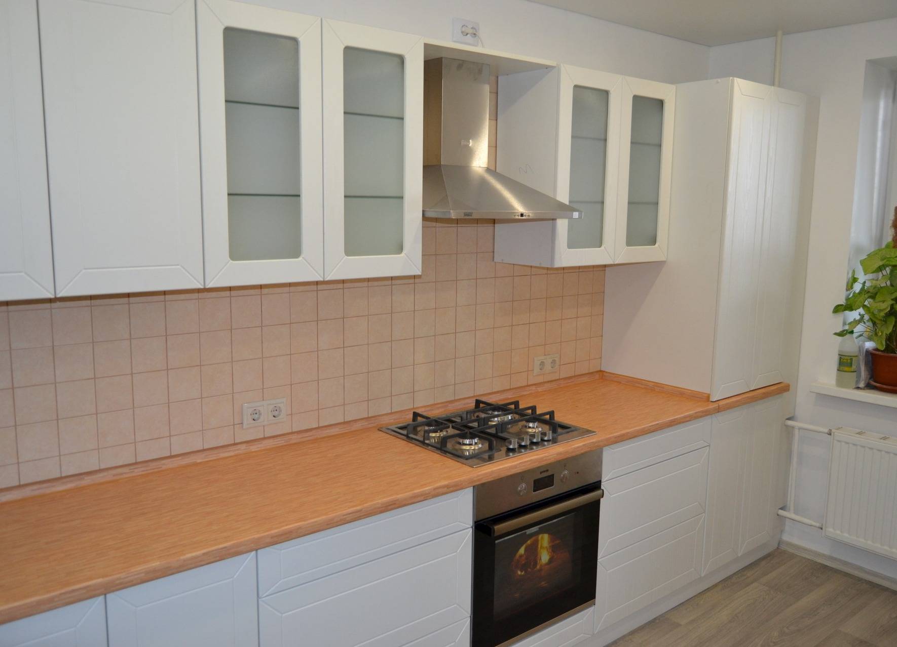 - над вытяжкой установили распашной шкафчик,