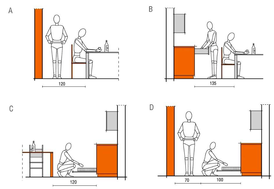 - При расстановке техники стоит ориентироваться только на свой рост, а не стандарты, придуманные компаниями. Техника должна находиться на уровне пояса, столешница — на 15–20 сантиметров ниже локтя.
