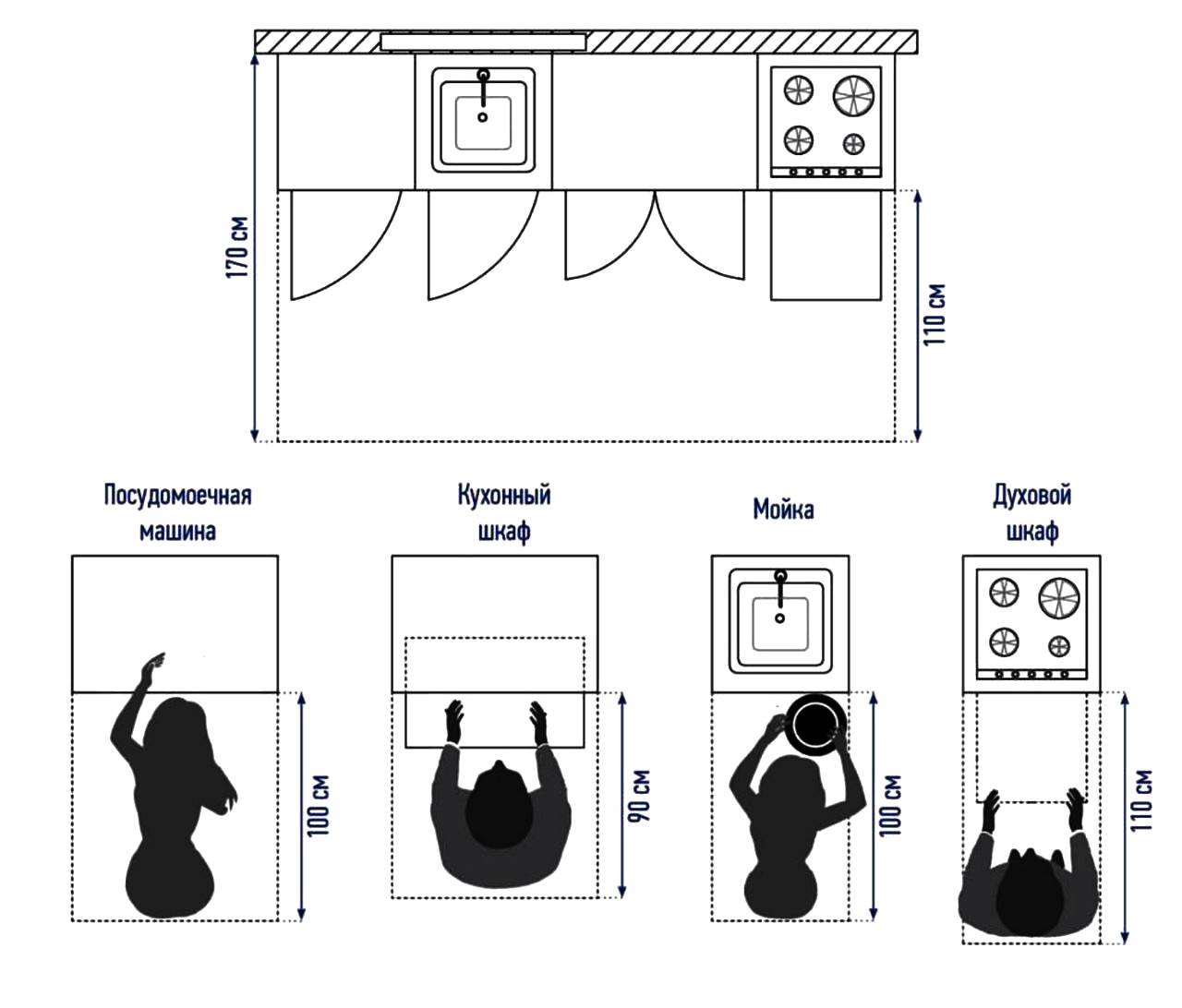 - рабочая зона — столешница, плита, мойка;