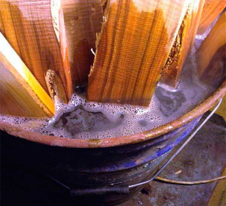Такая технология стабилизации используется реже, но от этого она не менее эффективна. Раствор готовится из расчета на литр воды – столовая ложка соли. После тщательного перемешивания в емкость укладывается деревянная заготовка, и посуда ставится на огонь. Термическая обработка (кипячение) производится в течение пары часов, и качественная консервация обеспечена. Критерий достаточности – прекращение выделения раствором пены.