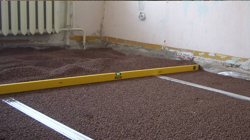 - Далее, в зависимости от выбранного сценария вы либо производите засыпку сыпучего ровняющего материала – чаще всего керамзита фракции ноль, либо укладываете утепляющий или звукоизолирующий слой – пенопласт, полистирол, из минеральной ваты или другой.