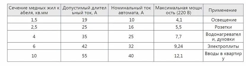 Учтите, что некоторые производители кабельной продукции откровенно халтурят, делая кабеля меньшего сечения, чем заявлено. Поэтому при выборе автоматов и провода стоит покупать их с небольшим запасом от предполагаемой нагрузки.