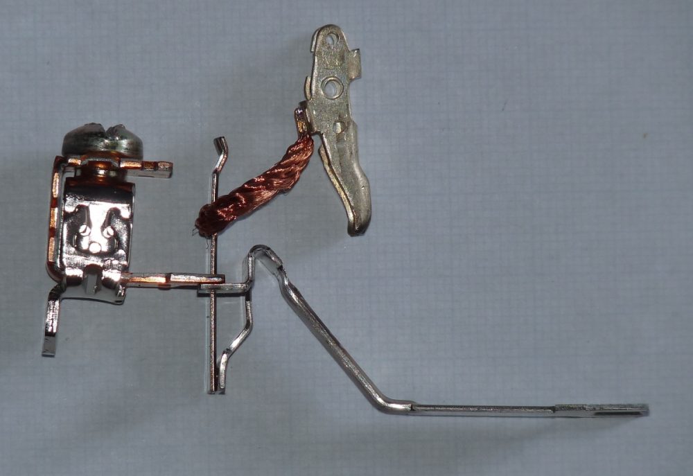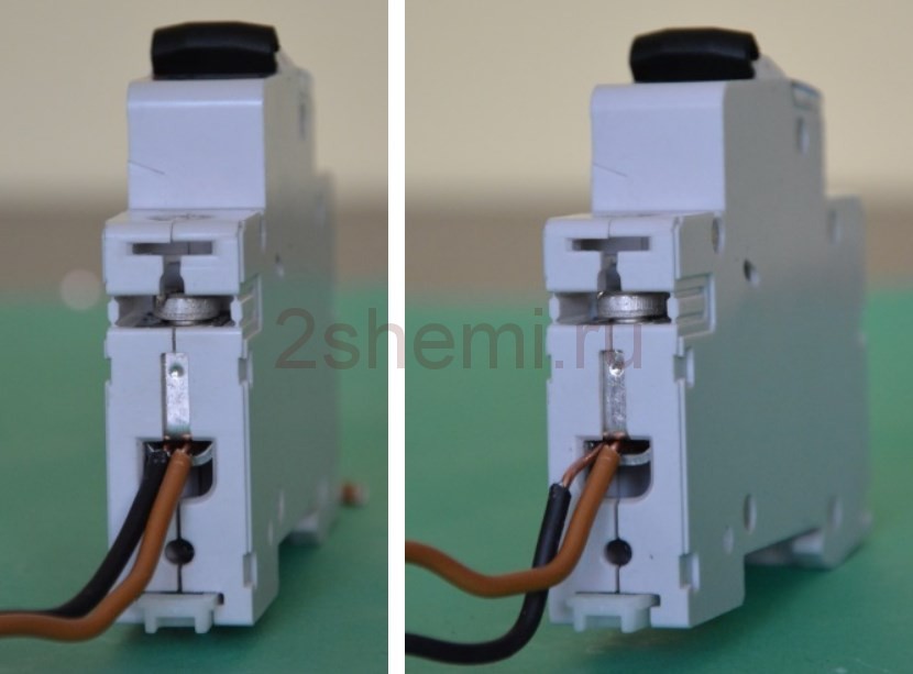За отключение питания под воздействием мощной нагрузки отвечает тепловой расцепитель, основой которого является биметаллическая пластина.