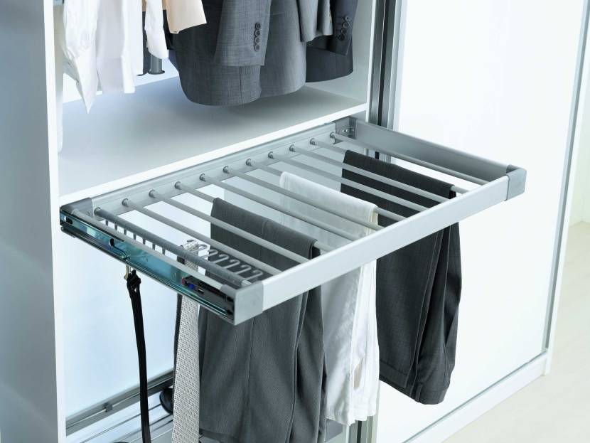 Брючница. Она имеет вид выдвижной секции с верхним, боковым, иногда с поворотным креплением. Брюки хранятся на рейках чаще в сложенном состоянии, иногда в полную длину. Брючница может дополнительно оснащаться держателем галстуков.