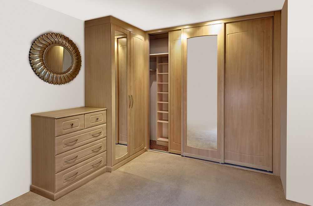 Угловое расположение шкафа-купе тоже подойдёт для небольшой площади. Посмотрите на фото ниже, может вам понравится?