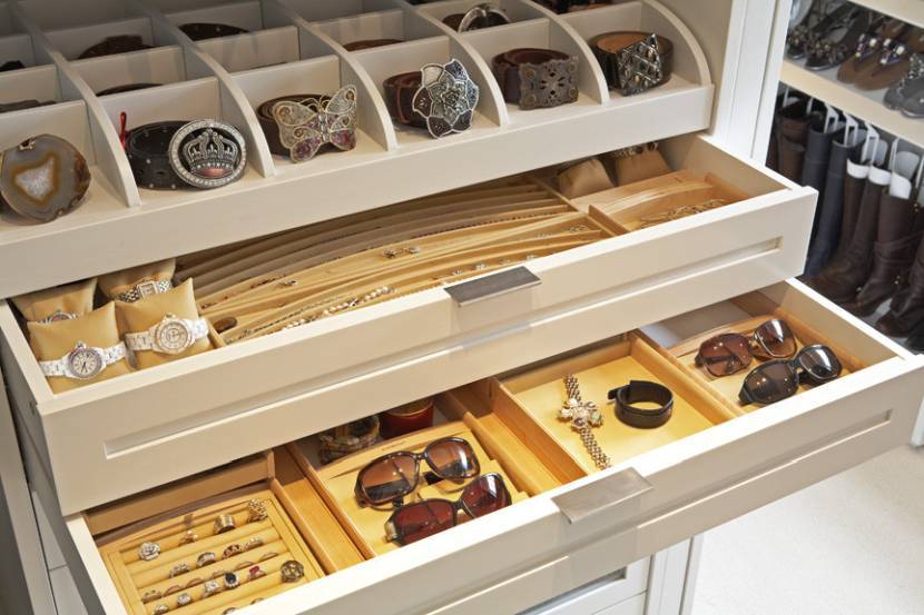 - Отделение для аксессуаров. Для аккуратного хранения ремней, часов, очков и других мелочей в шкафу планируют место для выдвижных ящиков особой конструкции. Ящик высотой 10-12 см разделяется на ячейки размером 10х10 см.