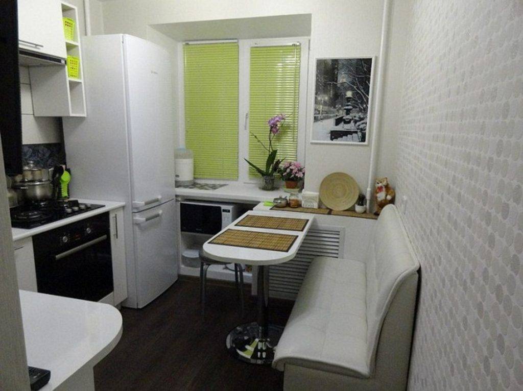 Существует очень много вариантов и идей рационального использования даже столь малого пространства. Ведь кухни в квартирах тех проектов имеют очень маленькую площадь — от пяти до семи квадратных метров.